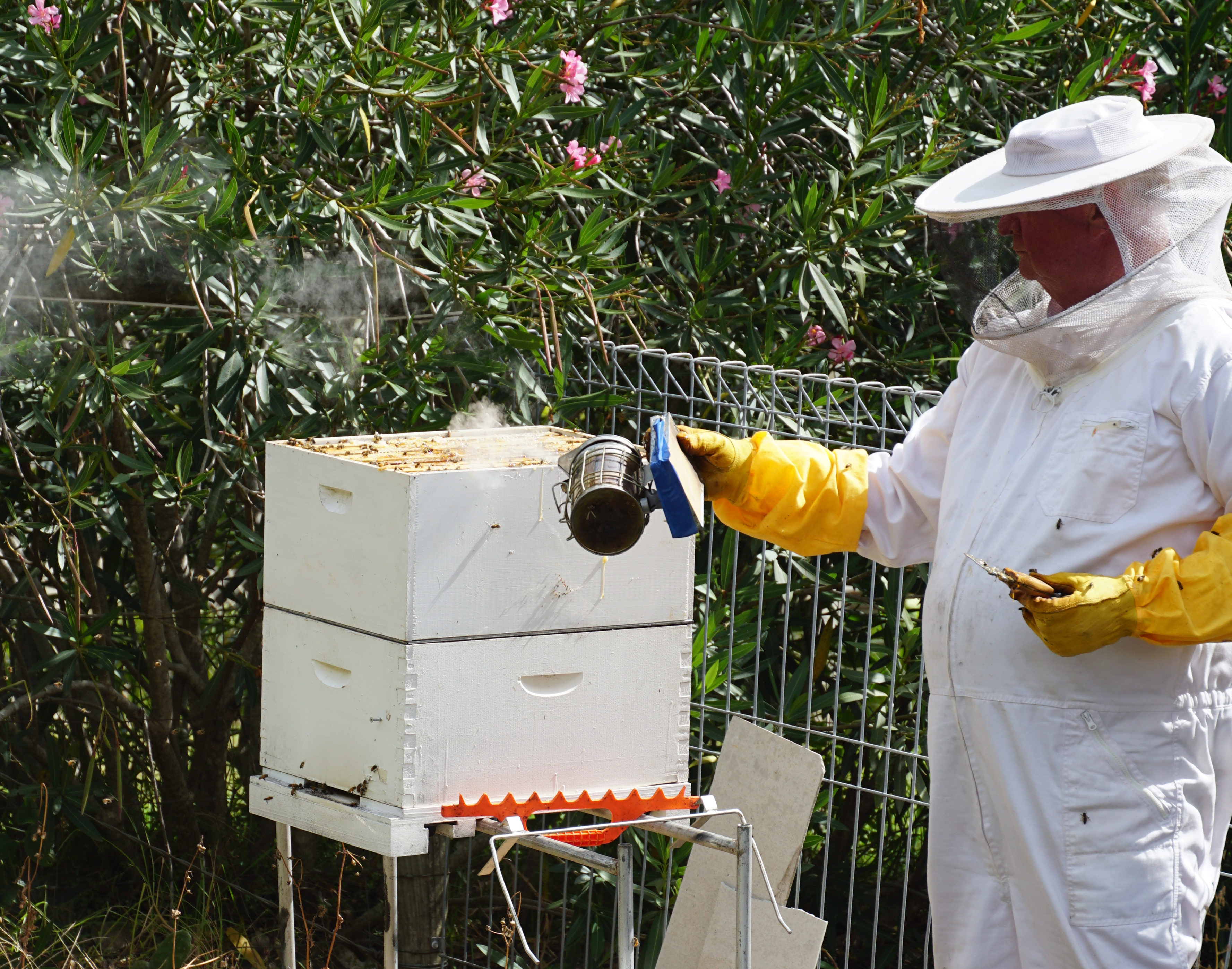 Then, there was Friday.  The day of “The Great Hive Robbery” (or maybe better named “Close Encounters of the Forty Thousand Kind”).  Yes, it was time for Dwayne to open the hive and remove a portion of the honey, which he assures us is surplus to the bees’ requirements.