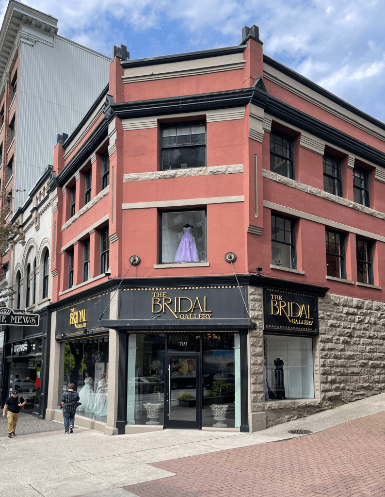 So, here I am, sitting on a bench in the main street of New Westminster, BC, waiting for Kirsty and Nanette to emerge from the nearby Aladdin’s cave of nuptial accoutrements.